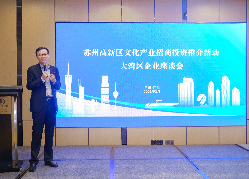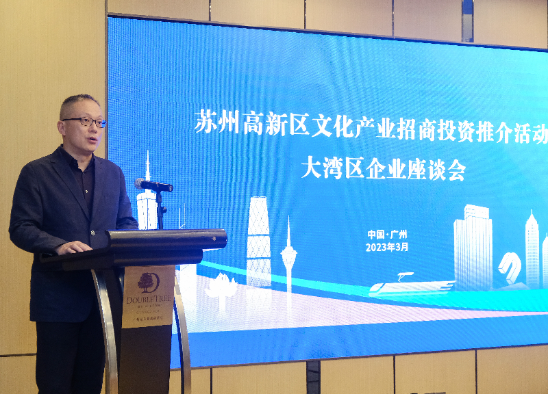 2023年3月30日下午,由蘇州高新區文體旅局、蘇州高新文旅集團共同主辦的“蘇州高新區文化產業招商投資推介活動——大灣區企業座談會”在廣州順利舉行。蘇州高新區文體旅局副局長周平,蘇州高新文旅集團副董事長、總經理高進以及來自大灣區文化科技領域的三十余名企業家出席了活動。