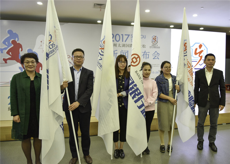 為展現蘇州市全民健身的良好氛圍,發布會上,朱奚紅女士、龔冀銘先生一同啟動了本屆賽事形象跑者征集活動。同時,周潔女士和蘇久華先生一同為本屆賽事名人名企跑團代表進行了授旗。