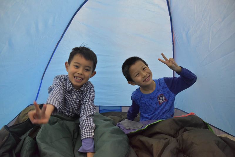 一天的活動結束后,在夜間的20:10,孩子們協作搭建起帳篷,開始在圖書館的夜宿體驗。