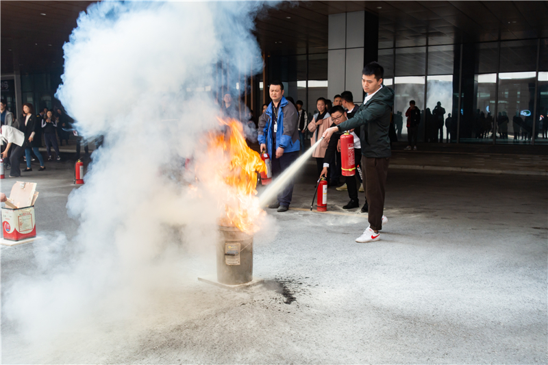 后續還在體育館門口進行了明火撲救實訓,主要流程包括觀察起火點狀況、學習使用滅火器、練習實地進行滅火。整個演習過程快速、安全、有序,全體參訓人員積極主動,掌握正確使用滅火器及逃生的方法,提高抗擊突發事件的應變能力。