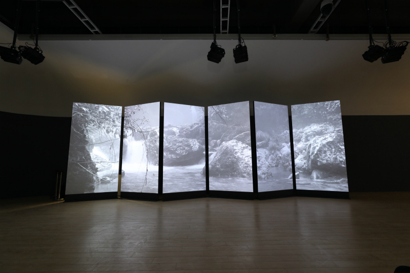 高世強的新媒體藝術創作《云山六章》將自然的山水“移到”實驗影像之上。管懷賓的作品連接古典與當代,將中國古典美學融入其空間裝置形態,使傳統文化元素在當代藝術語境中獲得廣泛的延伸與拓展。徐龍森的水墨山水畫作品《大物》《云山蒼蒼》,以大幅形式的呈現,直接追尋山水畫最本質的意義。王公懿的作品展現了他對古代文化精神的致敬,參展作品《輞川圖錯綜》《寒林》與《高古·太華夜碧》等都反映出其創作意圖與寒山精神觀的契合。來自天臺的藝術家梁紹基,他持續以蠶的生命歷程為媒介進行藝術創作,本次參展的《云》是他攜蠶絲彌滿的鏡子驅車去天臺名勝瓊臺仙谷追云的記錄。