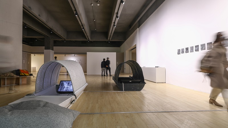 這是一次來自不同領域藝術家,在寒山美術館中實現的別具風格的“跨界”式群展,藝術家們以聲音符號構筑起可供“聆聽”的城市“音景”。所展作品既有以蘇州傳統的音景內容為素材的創作,如參展藝術家聶俊在《寒山108》中引入寒山寺的新年鐘聲,在八邊形的立體空間中,運用波場合成系統再現3D聲景,創造沉浸式聲音體驗環境。而傳統昆曲的主奏樂器——板鼓及銅響器也在金佐寧的作品《歸》中以現代展出形制,傳達昆曲鑼鼓在以視覺為主導的當代社會關系中的處境。