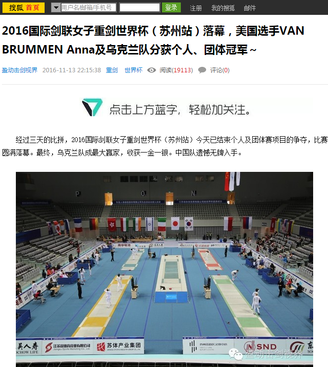 2016國際劍聯女子重劍世界杯(蘇州站)落幕,美國選手VAN BRUMMEN Anna及烏克蘭隊分獲個人、團體冠軍~