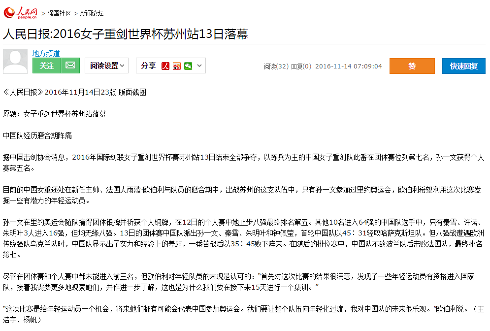 據中國擊劍協會消息,2016年國際劍聯女子重劍世界杯賽蘇州站13日結束全部爭奪,以練兵為主的中國女子重劍隊此番在團體賽位列第七名,孫一文獲得個人賽第五名。