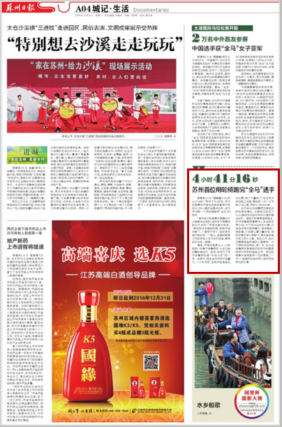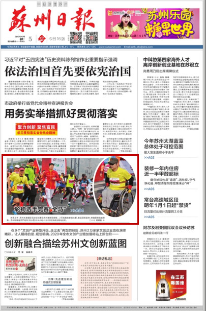 蘇報訊(記者 周建越)“4小時41分16秒!”昨天下午1時多,蘇州輪椅賽手嚴培龍在陣陣掌聲中完成42.195公里的全程馬拉松,成為蘇州第一個用輪椅跑完“全馬”的選手。