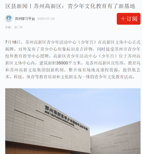 區縣新聞丨蘇州高新區:青少年文化教育有了新基地